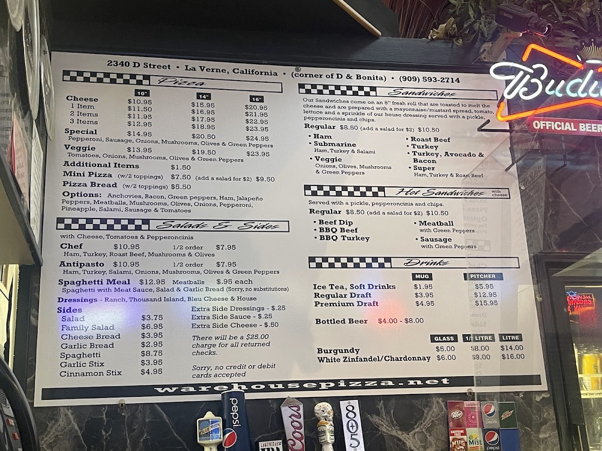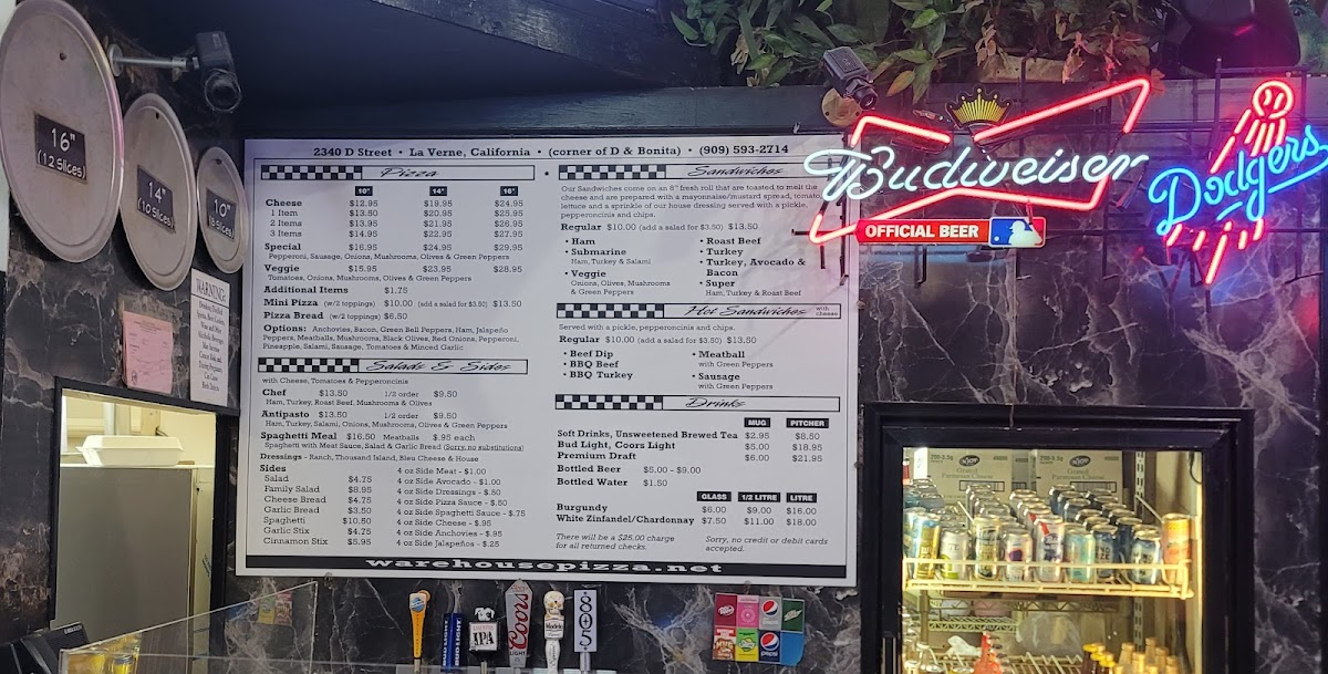 Welcome to Warehouse Pizza, a beloved gem nestled in La Verne, California. This family-owned pizzeria offers a vibrant atmosphere, perfect for both indoor and outdoor dining. With its charming decor featuring vintage games, it’s a nostalgic hotspot for locals. Customers rave about the delicious pizzas, especially the pepperoni and mushroom, topped generously with cheese. The sauce, a highlight of the menu, is noted for its rich flavor that keeps patrons returning.